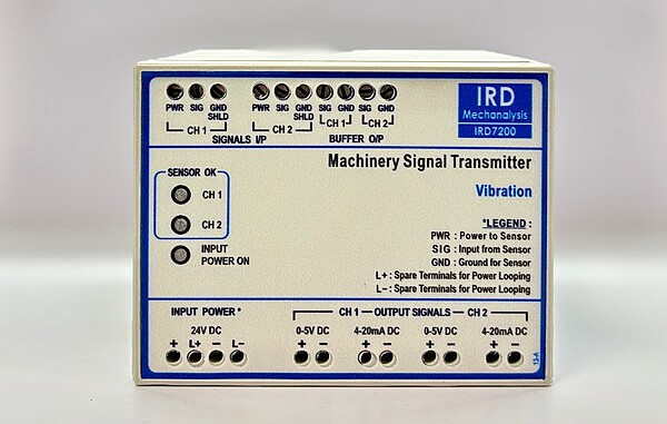 IRD7200 Machinery Signal Transmitter (MST), Vibration Monitoring, Din Rail Mounted, 2 Channel, 100mV/g Sensor Input, Custom Range, 4-20 mA output, 0-5 V DC Output, Buffered Output on Terminals