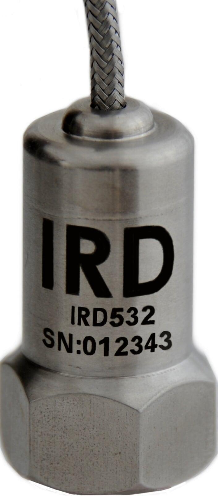 IRD532 is a Top Exit Single Axis Velometer that provides Vibration Velocity Output with a Sensitivity of 4 mV/mm/sec. This Sensor can also be used for Online Casing Vibration Monitoring via our Transmitters IRD7200, IRD7400 and IRD7100. This Sensor can also be used with our API670 Compliant Machinery Protection System IRD8800. For process connection it has a 1/4"-28UNF Female Thread on its base. We can provide IRD532 with required accessories for mounting - be it a magnet or stud or mounting pad. IRD532 is an IEPE type Vibration Sensor and can be ordered in Shear or Compression construction. It has a Hermetically Sealed IP68 rated Body. IRD532 has Integral SS Braided Cable that can be ordered for a minimum length of 5 meters and maximum length of 30 meters.