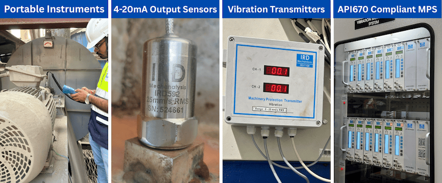 We provide Portable Instruments as well as Online Systems for Vibration Monitoring. Our Portable Instruments include Vibration Meters and Vibration Analysers. Our Online Systems range from Simple Loop Powered Vibration Sensors that give 4-20mA output to DCS/PLC/SCADA/Cloud to sophisticated Vibration Transmitters and Machinery Protection Systems that not only Monitor Vibration - but also help Protect Machine from Breakdown in event of High Vibration