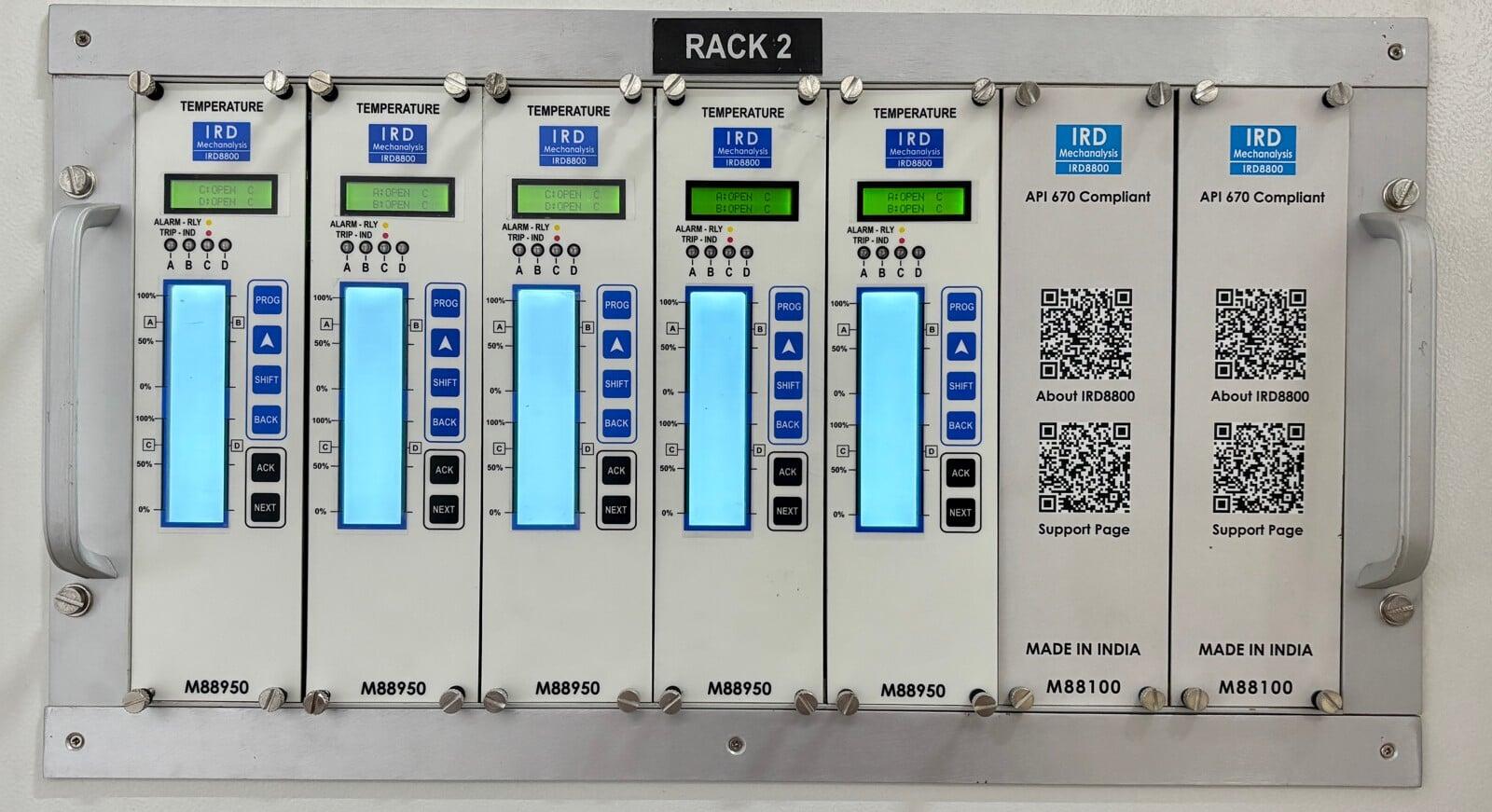 IRD8800 Machinery Protection System (MPS) is a family of Rack mounted monitoring system made by IRD. It has modules for measurement of Vibration, Temperature, Speed, Axial Gap and more. The modules accept Redundant Power Input and are hot swappable and comply to API 670 requirements.